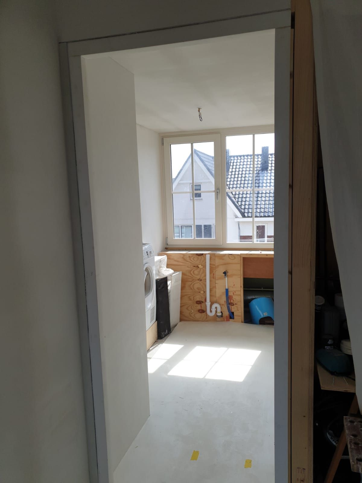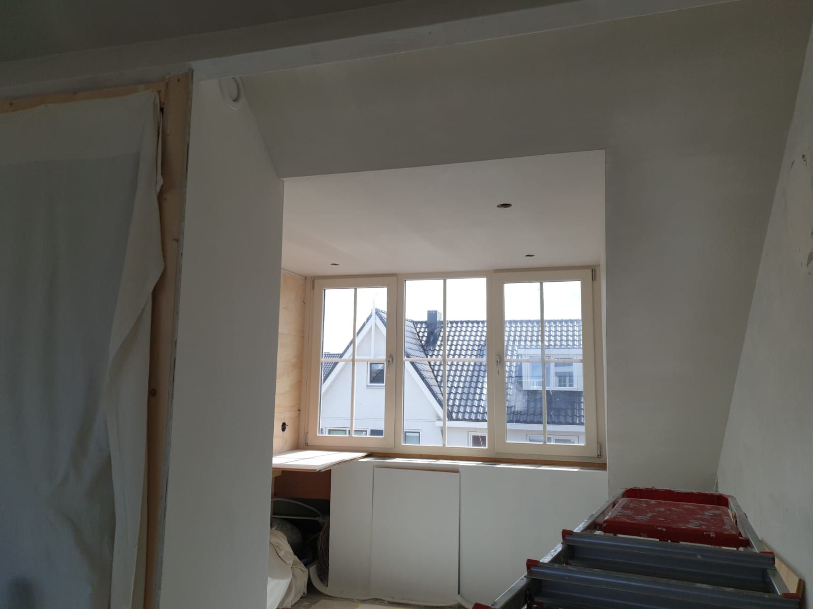 De toevoeging van een dakkapel geeft deze zolder meer ruimte en licht. Met ons stucwerk zorgen we voor een strakke en naadloze afwerking van de wanden en het plafond.