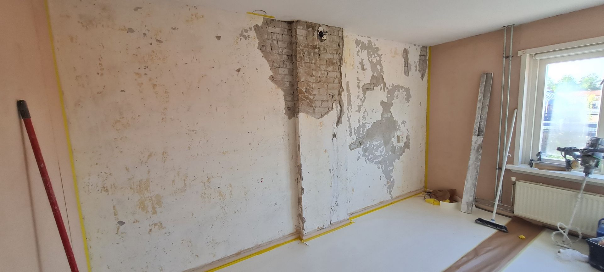 In de slaapkamer liet het oude stucwerk los van de schoorsteenmuur, dus hebben we zowel de schouw als de aangrenzende muren opnieuw gestukadoord. Ook de schoorsteenmuur op zolder kreeg een nieuwe afwerking, aangezien deze ruimte een nieuwe functie zullen krijgen.
